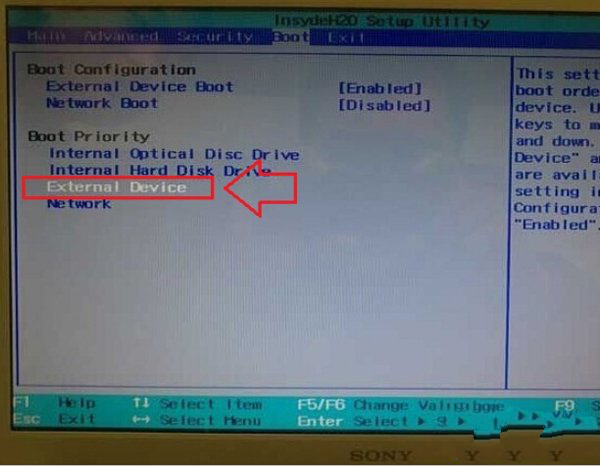 1.当索尼笔记本电脑重新启动或直接开机时,按F2键进入索尼笔记本电脑BIOS设置。然后用键盘左右键切换到启动选项,再用键盘上下键选择“External Device Boot”,然后按回车键进行操作,选择设置为:启用,然后使用Enter 键确认。是的,如图所示:
