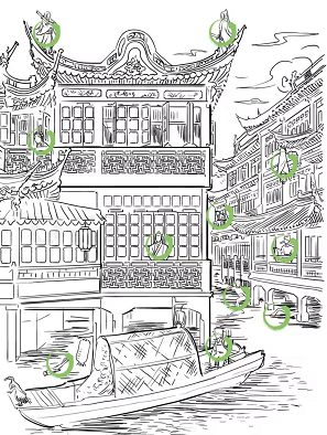 2.楼顶有【夜孤城】和【西门吹雪】,下方窗户边有【窗人】。点击二楼的【灯笼】,灯笼亮起后即可找到【皮影傀儡】。有一个人,【船后】有一个人坐,前面水中有一个【潜水人】,【右边楼上】可以找到很多人;