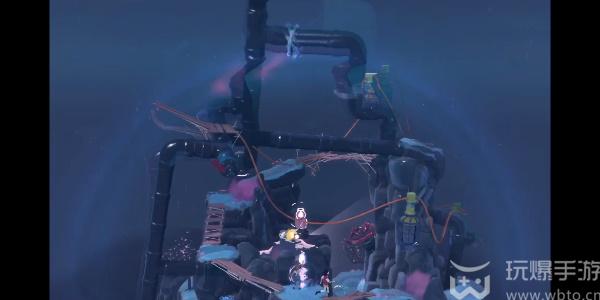 2.我们继续往下走,直到到达第一个有雾的地方,转动视角,水滴就会连接到电线上。灯亮了之后,雾就会散去,然后我们就可以过去了。
