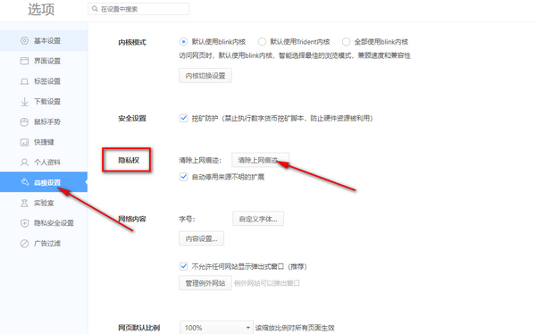 2、进入后,在【高级设置】下,找到【隐私】,然后进入【清除互联网痕迹】页面,如图。