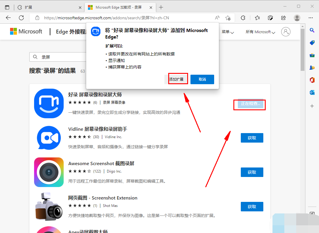 4、来到搜索到的页面,点击---【首屏录屏软件】--【获取】--【添加扩展】,完成后界面右上角会出现录屏功能。