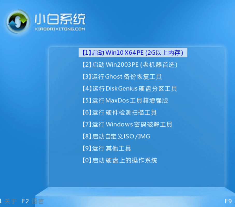 4.然后将USB启动盘插入系统损坏的计算机中。在启动界面选择U盘启动项按回车确认进入pe选择界面,选择第一个pe系统按回车进入。