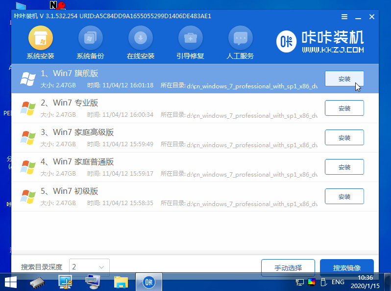 5、在pe系统中打开卡卡安装工具,选择win7系统,点击安装到c盘。
