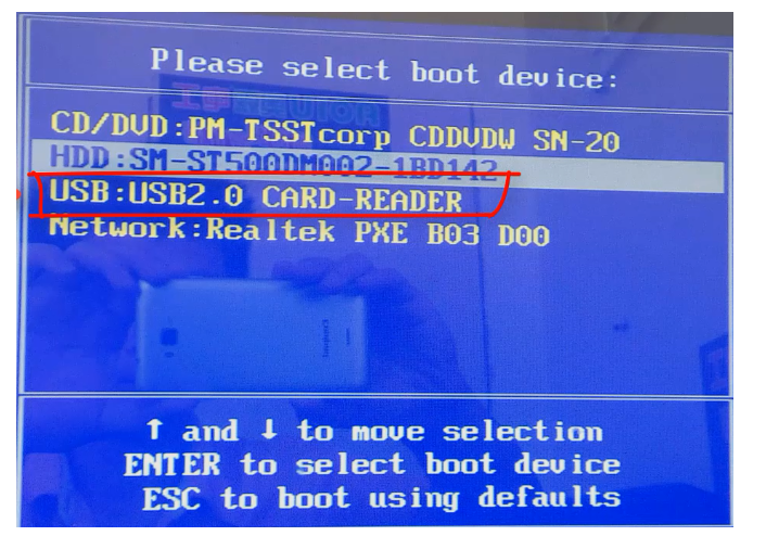 4、将USB启动盘插入需要重装的电脑。重新启动计算机时,连续按启动快捷键即可进入快速启动页面,选择以USB开头的U盘启动项进入。