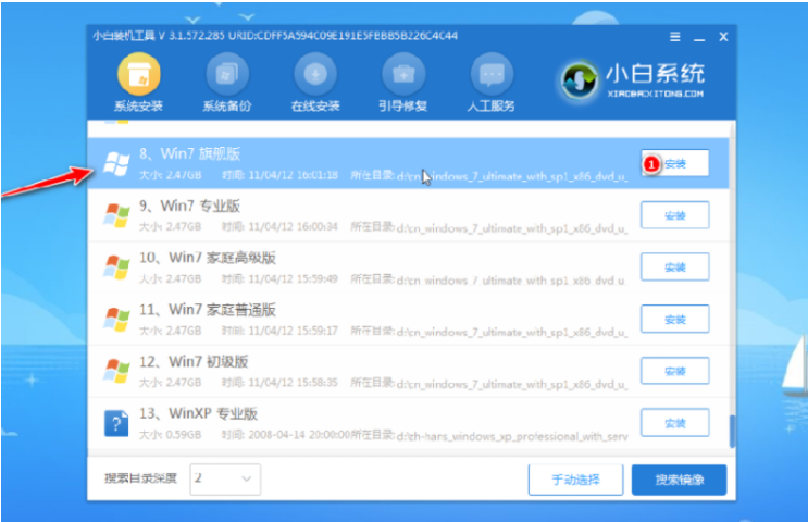 6、当电脑处于PE系统时,点击打开小白安装工具选择win7系统进行安装,目标分区选择C盘。