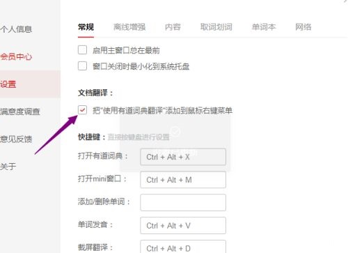 3、进入新界面后,找到右侧的“将使用有道词典的翻译添加到鼠标右键菜单”并勾选。