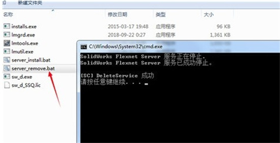 1、首先我们下载并解压下载的安装包。解压后进入“solidworks_flexnet_server”文件夹,用管理员权限打开“server_remove.bat”