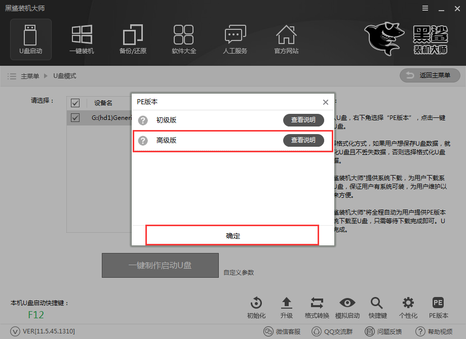 第四步:选择PE版本。 Installation Master有两个PE版本,一种是适合日常电脑维护的入门级版本,另一种是适合安装人员的高级版本。小编这里选择高级版本,然后点击确定。