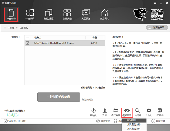 第8步:USB闪存驱动器现已完成。如果想知道U盘是否创建成功,可以在U盘模式下打开右下角的模拟启动,选择BIOS启动。