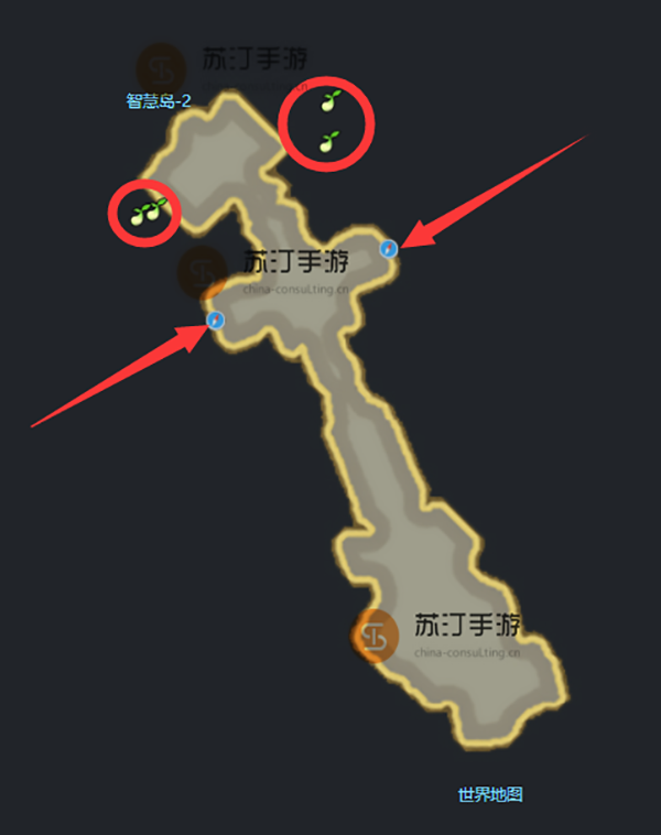命运方舟智慧岛:4颗mococo种子。地图顶部的红色箭头标记了隐藏通道的入口。地图的两侧都有隐藏的入口。一个隐藏入口中有2 颗mococo 种子。具体位置如图: