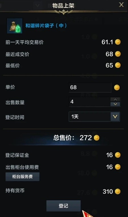 1.最后我们打开交易银行将刚刚获得的精炼材料上架。我们可以看到1个【中和谐碎片包】可以卖68,我们来设定价格,选择上架数量,最后选择注册。然后你只需要等待物品出售和钱到账即可。