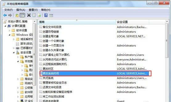 打开“组策略编辑器”窗口,然后找到(计算机配置-Windows配置-安全设置-本地策略-用户权限分配)目录。双击右侧窗口中的“更改系统时间”选项
