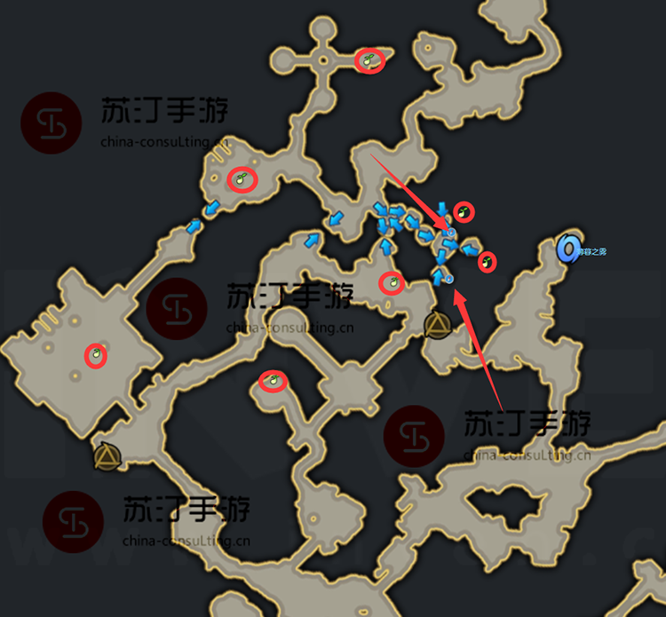命运方舟镜谷:7 颗莫可可种子。地图右侧,两个红色箭头为隐藏入口,红色圆圈为对应的Mococo位置。具体位置如下: