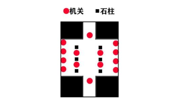 石棺室内地面共有机关六处,南北门各一处,东西石柱各两处。此外,东西墙上各有四个火箭发射机构,左右各有三个石棺,中间还有一个大石棺。这是这个地方的布局。