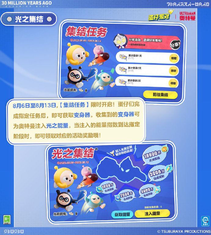 照亮黑暗,击退邪恶! 8月11日《蛋仔派对》奥特曼同步启动,联动角色今日公布!无论黑暗多么强大都不会退缩的蒂迦、拥有丰富战斗经验和格斗技巧的零、正义感强烈、能量无穷的泽塔,三位光之巨人来到了蛋仔岛。与Eggboy 战斗。让我们携手面对强敌——太空忍者巴尔坦吧!