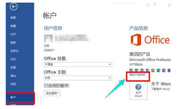 步骤2:单击“帐户”并选择“更改产品密钥”。