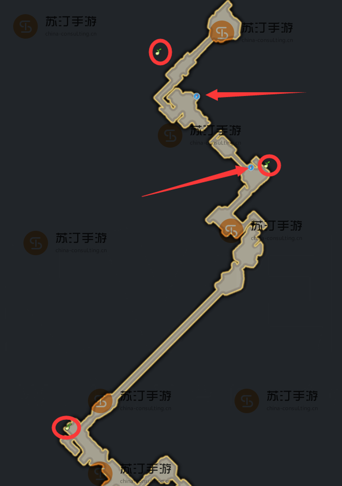 下面红色箭头隐藏的入口需要“在地图上的这个位置进行调查,然后楼梯上的铁门就会降下,可以到达这里右侧的Mokoko”。