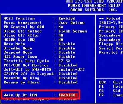 在电源管理设置窗口中,将“Wake up on LAN”项设置为“Enabled”。