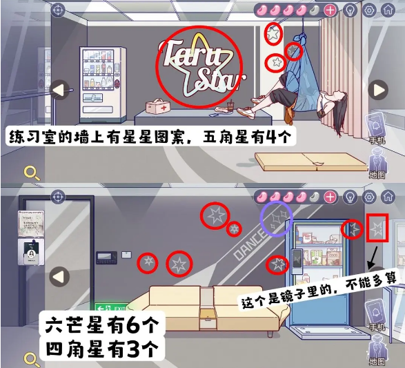 3、后墙上会有一些五角星,沙发场景的墙上也有五角星。总数为:五角星4颗,六角星6颗,四角星3颗,所以对应的密码为[463]。