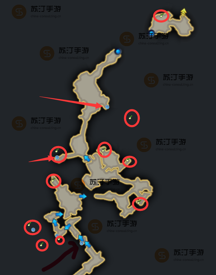 地图上红色箭头位置是一个隐藏入口。这张地图上的隐藏入口相当多,主要集中在地图的底部。玩家可以仔细探索相应的道路,找到相应的隐藏入口。 Mococo的详细位置已经完全标注出来了。详细位置如下: