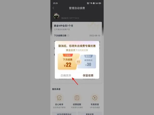 5、出现“取消后,您将失去专属续订折扣”界面,点击【无奈放弃】选项。