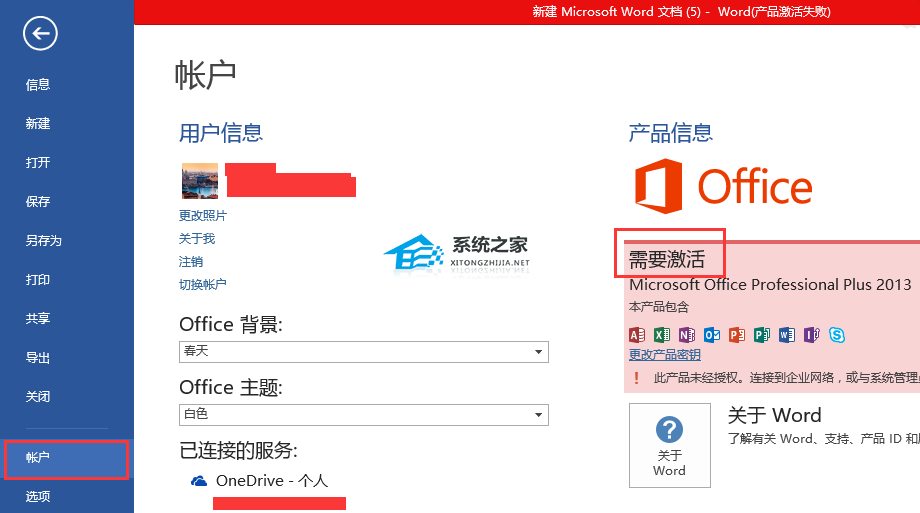 2.选择左侧蓝色菜单中的倒数第二个选项“账户”,右侧会出现一个新的信息菜单,您可以查看您的Office是否已激活。