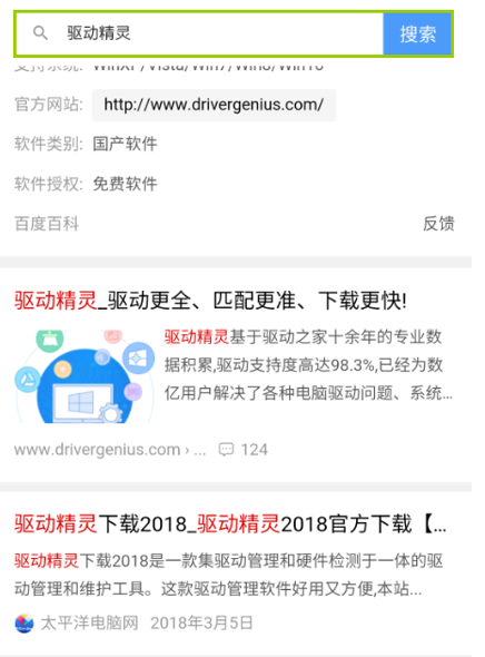 1、首先在安卓手机的“浏览器”中打开百度,搜索“驱动精灵”,选择驱动精灵进入。