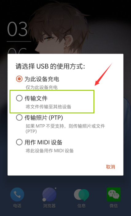 5、使用数据线将安装有驱动精灵通用网卡版的手机与电脑连接。手机会弹出如下提示,选择“传输文件”进入(如果没有点传输文件,就没办法用电脑打开手机盘)