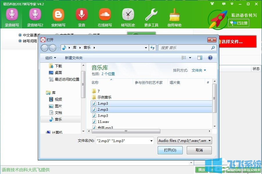 2、选择需要转写的文件,点击“打开”按钮,选中所有需要转写的录音文件;