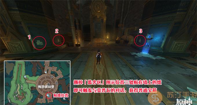 1.传送到“监狱区”下方的锚点。锚点两侧的墙上都贴有三张纸。将它们全部撕掉即可触发与Mopowa的对话并获得一个普通的宝箱。