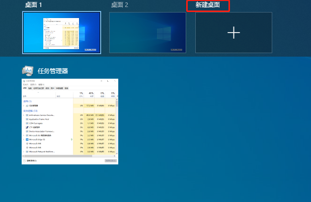 4.或者打开任务管理器,然后按win+Tab打开多桌面功能,然后单击新建桌面。