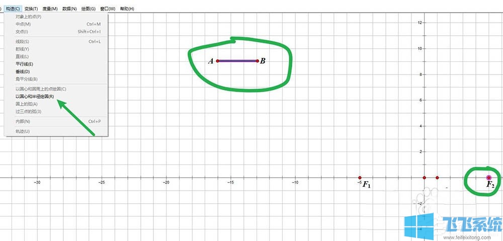 5、接着点击焦点F2。再点击线段AB,然后点击导航栏上的以圆心和半径绘制圆