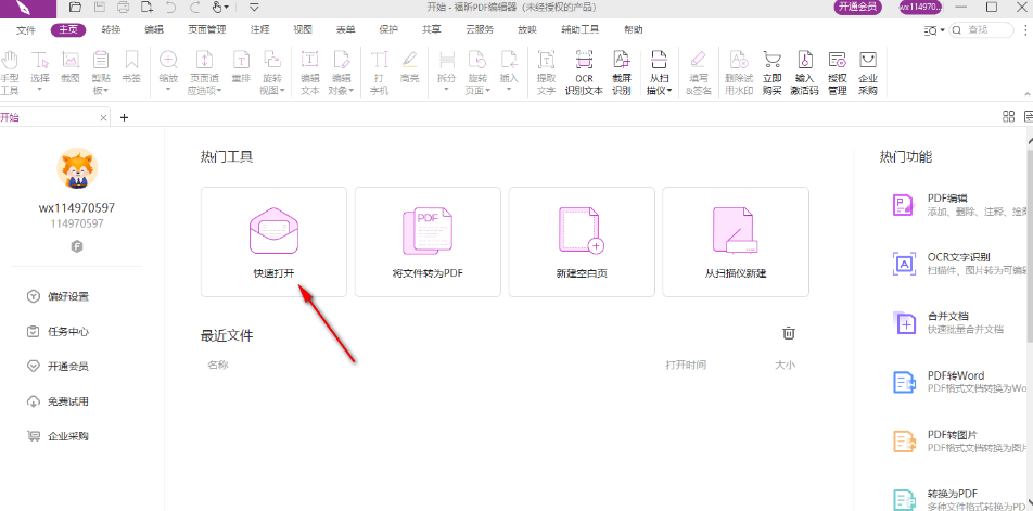 首先,打开Foxit PDF Editor主页面,在打开的主页面上选择“快速打开”选项,将要编辑的PDF文档导入到软件中并进入编辑页面。