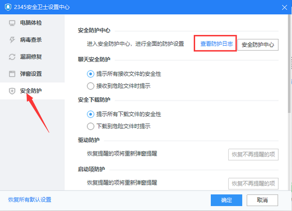2. 在新界面中,点击左侧的“安全防护”选项,然后点击“查看防护日志”。