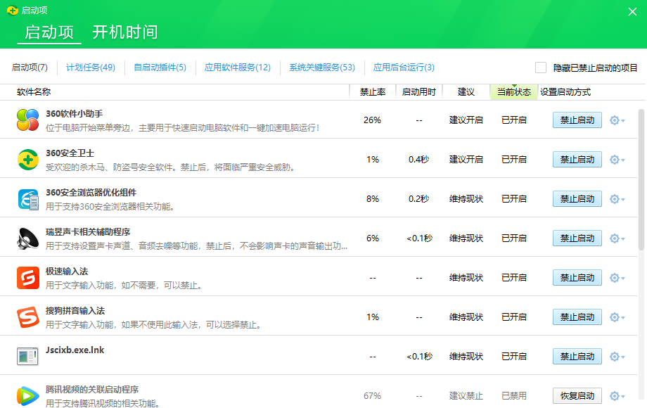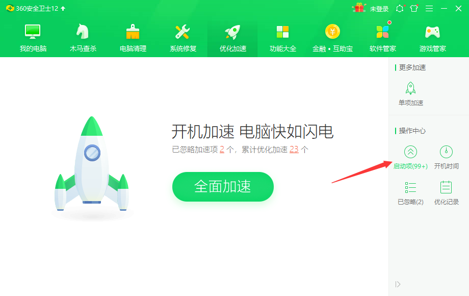5、您还可以通过一些第三方应用程序来管理应用程序管理应用程序的启动功能,例如360安全卫士。打开优化加速-启动项。