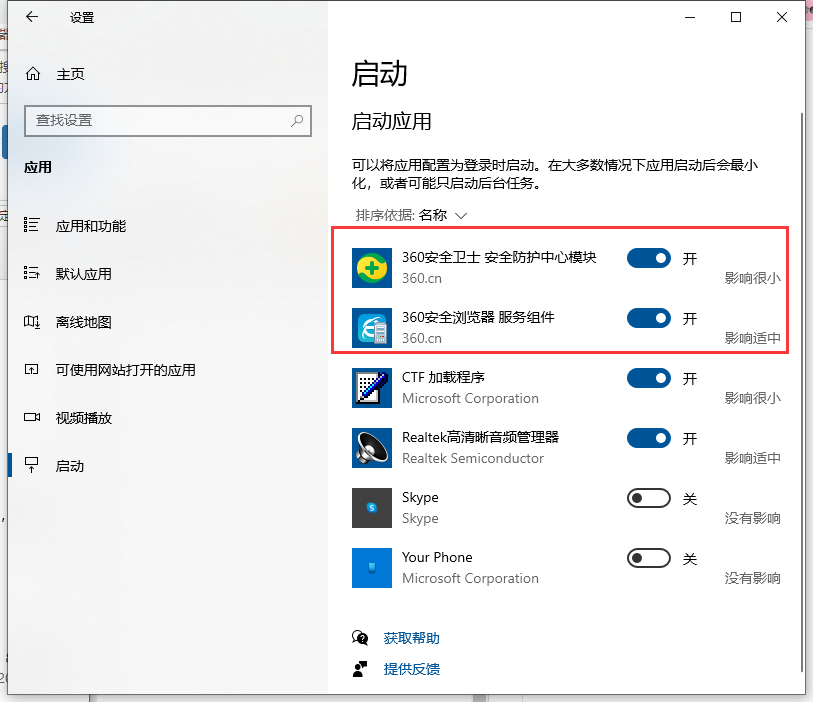4. 在右侧的启动应用程序页面中,可以看到当前开机自动启动的应用程序。单击右侧的开关可将应用程序作为启动项打开或关闭。