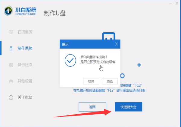 4、等待U盘启动创建完成并询问是否预览,点击取消。然后检查快捷方式目录,找到您计算机对应的启动热键。