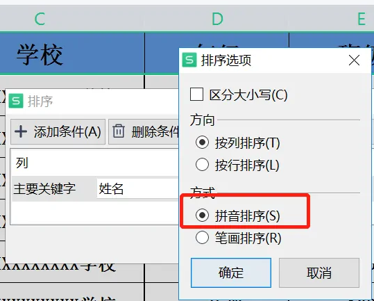 4、点击“选项”,弹出对话框,选择“方向”勾选“按列排序”,“方法”勾选“拼音排序”。