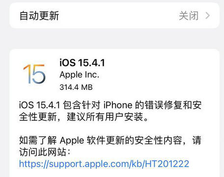 2、iOS 15.4.1的更新描述为:本次更新包括针对iPhone的以下错误修复