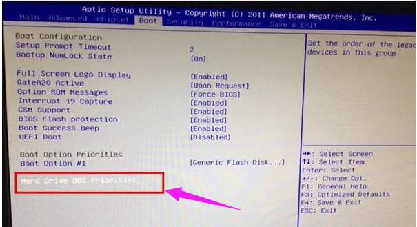 2、然后按左右方向键将光标移动到“BOOT”选项,再按上下方向键将光标移动到“Hard Drive BBS Priorities”选项,然后按回车键即可进入另一个设置界面。