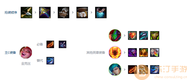 1. 首先给金克丝幽灵之刃和低语。如果没有耳语,可以考虑巨人杀。给Panser 和Thresh 额外的肉质装备。 心之钢可以给潘森增加伤害减免。