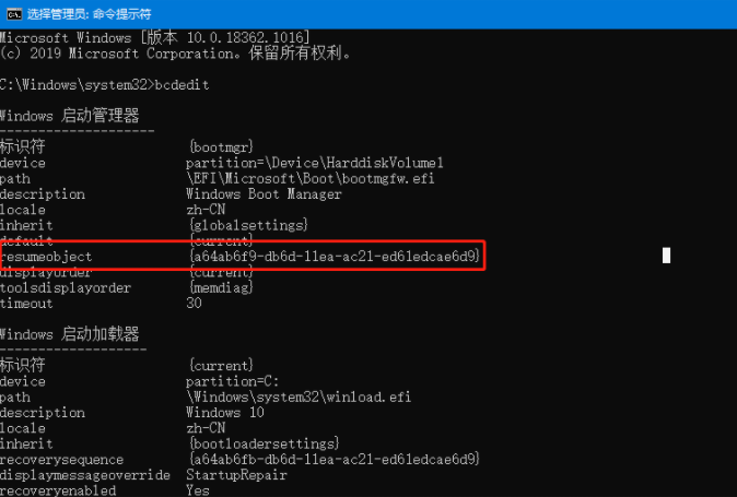 4. 在命令提示符界面中,输入bcdedit并回车,然后找到resumeobject并记录以下字符串。