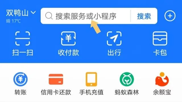 打开支付宝后,找到主界面顶部的搜索栏,输入“银行卡”。