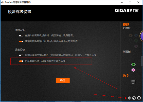 2.打开右下角的小齿轮,设置如下,主要是要把: ”将所有的输入插孔分离为单独的输入设备“ 打开。