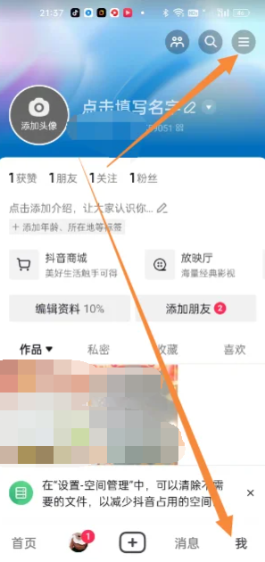 1、首先我们打开抖音,点击右下角的我,然后点击如图所示的三横图标。