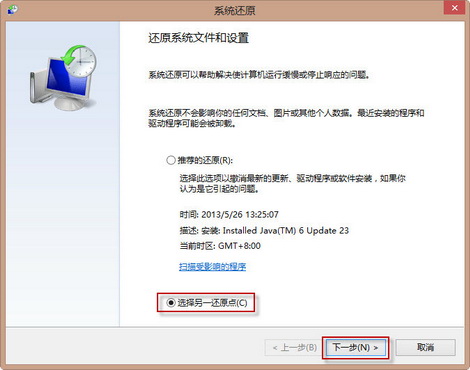 3、选择一个还原点,点击“下一步”。如下图: