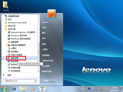 1、在开始菜单中,顺序点选“所有程序”-“附件”-“系统工具”-“系统还原”。如图所示: