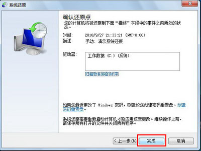4、在“确认您的还原点”中,点击“完成”。如下图: