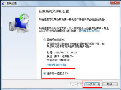 4、选择“选择另一个还原点”,点击“下一步”。如下图: