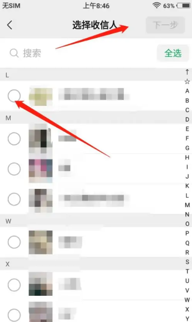 6.最后我们选择接收好友,勾选全部后点击下一步,将群消息发送给所有人。